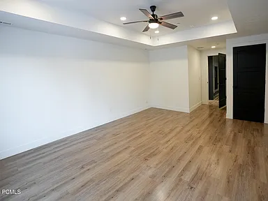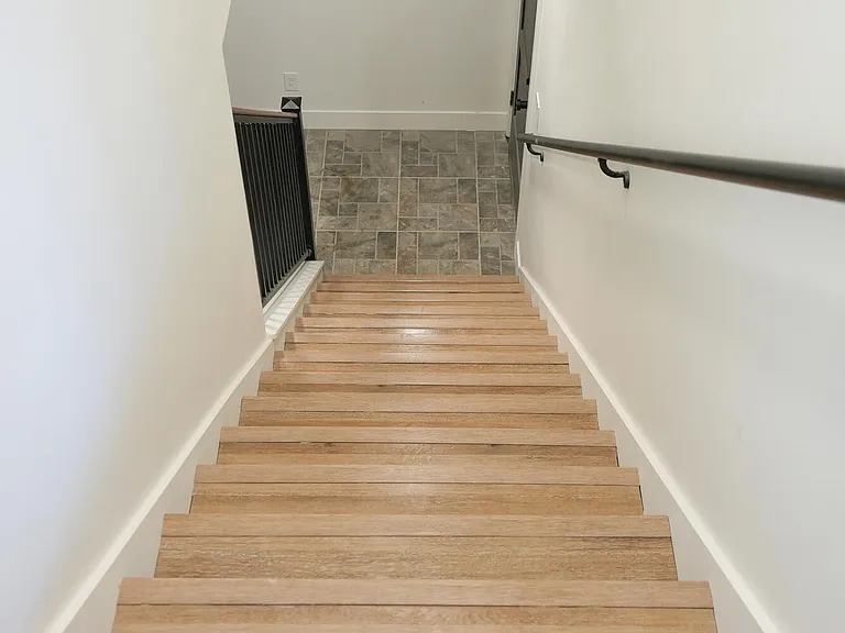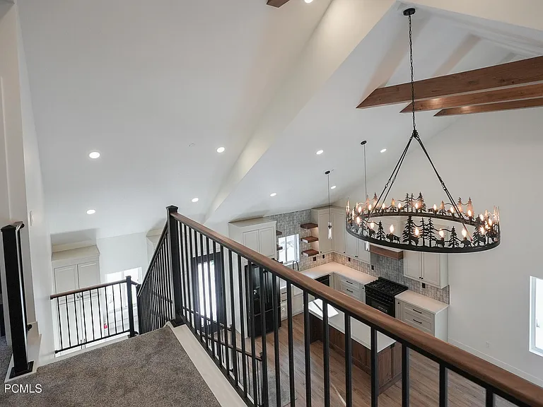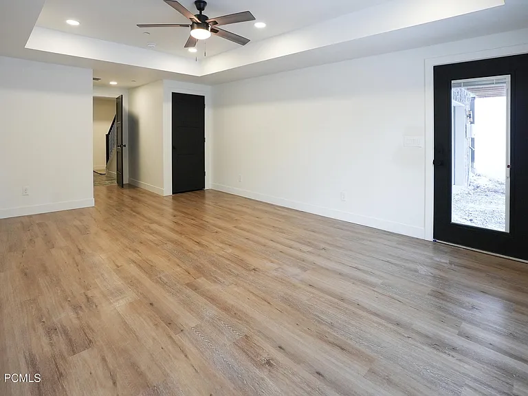 This cabin features a clean, simple design with a uniform paint color throughout, accented by dark doors and a fireplace wall. Painting the doors a separate color from the trim and walls is an effective way to achieve a modern two-tone look at the cost of a single tone, as it eliminates the need to mask trim.